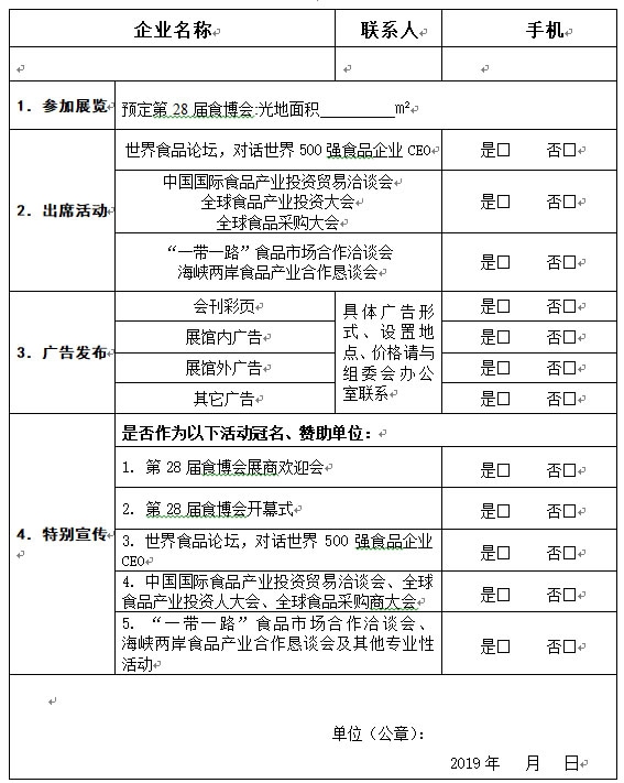 第28届中国食品博览会暨中国(武汉)国际食品交易会参展登记表